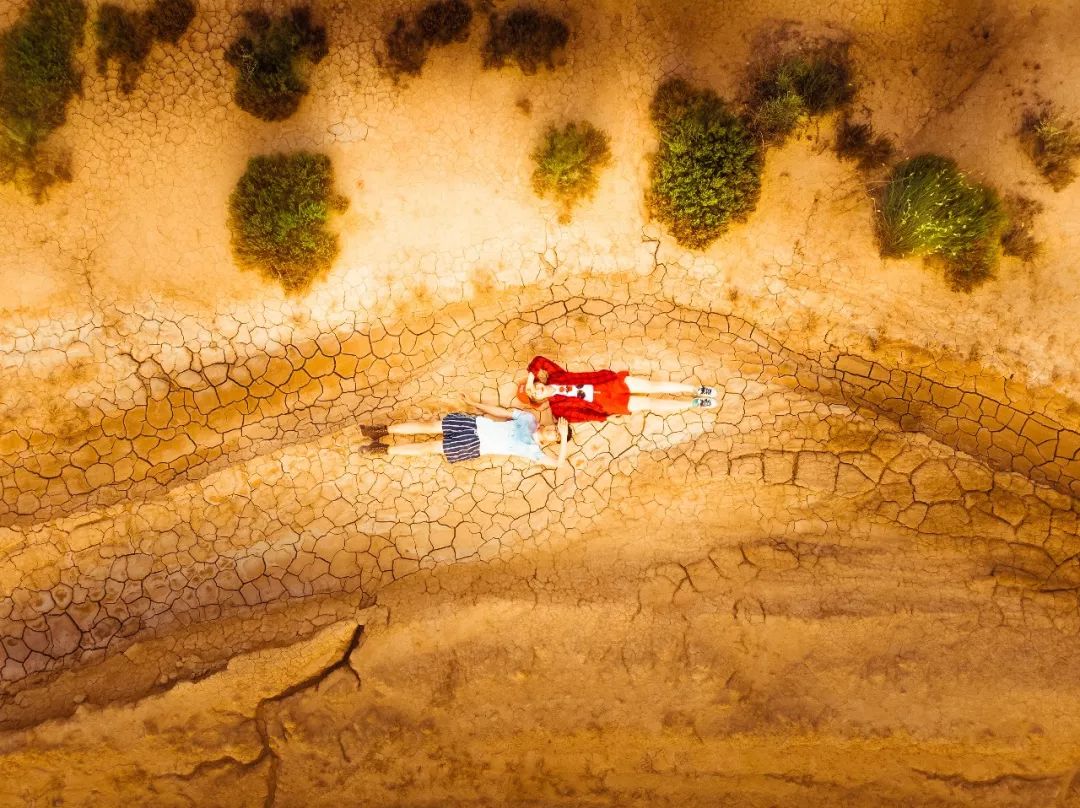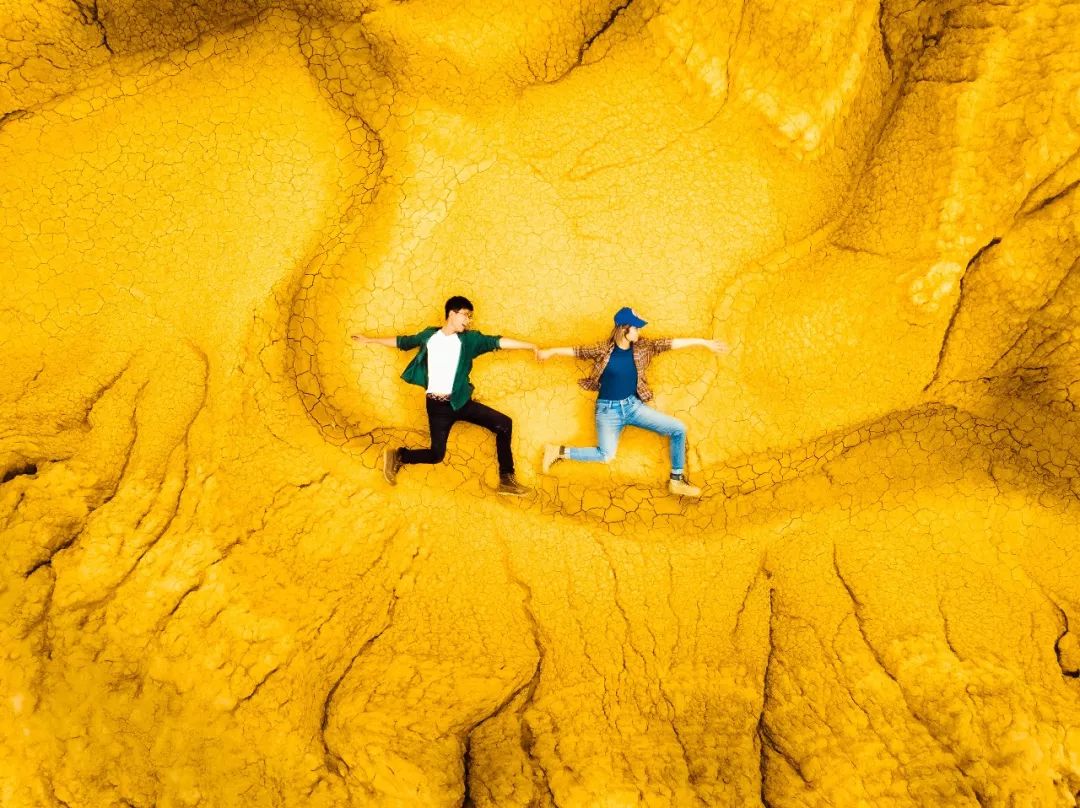 说到动作姿态,我们是有几套固定动作的,比如“拉着手奔跑”、“头靠头躺下”等等,这些动作我们到了每个地方都会拍,不过更有趣的是,能够结合地形的线条感,拍摄一些更具创意的动作。