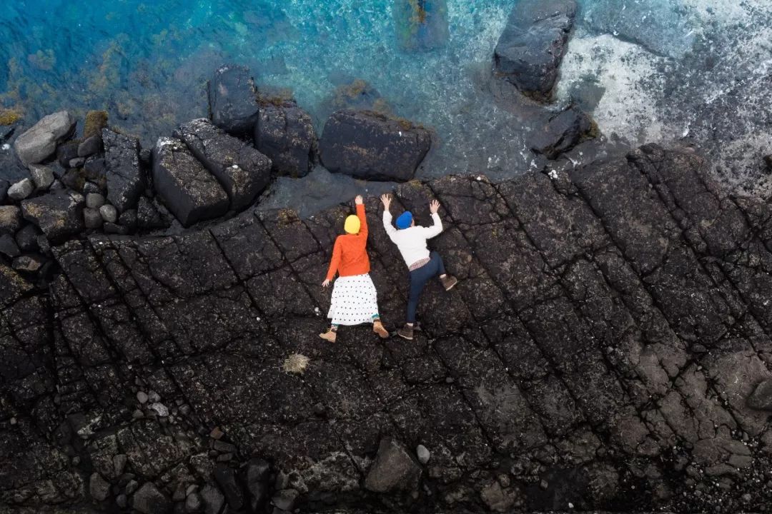 比如我们在天空岛找到了一片黑色礁石。从天上看就好像是一座险峰,我们便趴在地上,做了个攀爬的姿势,效果也很不错。总之,多尝试、多拍,才能拍出最完美的一张照片。