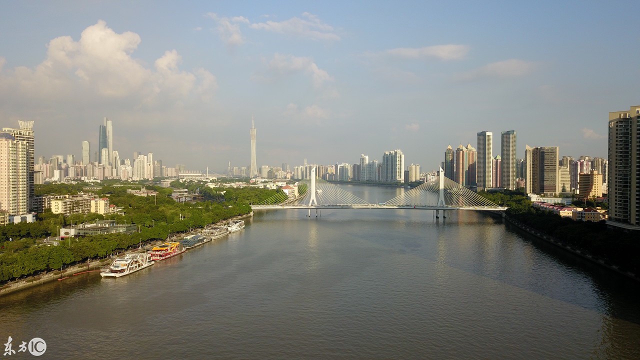 海印大桥,因为桥的北端位于羊城三石的海印石而得名。大桥由186根钢索星形拉固,塔顶像两只"羊角",寓意羊城。海印大桥一艘双桅船在旭日初升时扬帆远征,夏夜像两把巨大的竖琴伴随着孱孱流水奏响悠扬动听的乐章。是珠江河上别具特色的第四座公路桥。(图片来自东方IC)