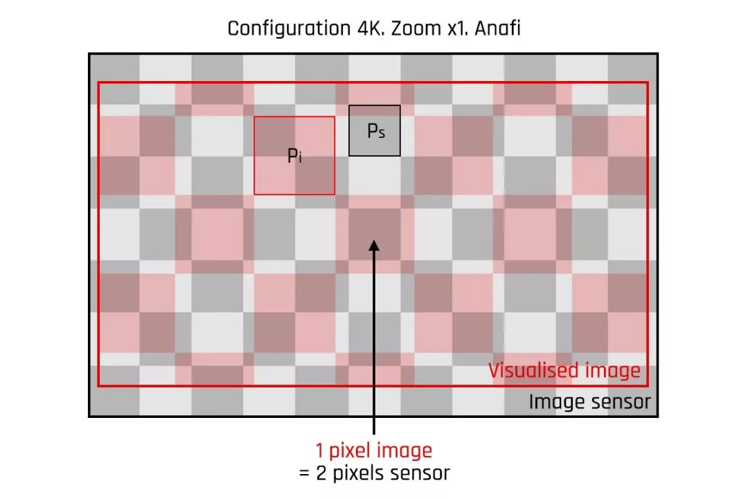 使用ANAFI的相机,4K UHD的最小变焦值(1x,即无变焦)对应于图像传感器上2像素区域上显示的一个像素,如图所示。让我们称之为Ps传感器像素表面,Pi为图像像素表面。然后我们得出如下等式(1)。