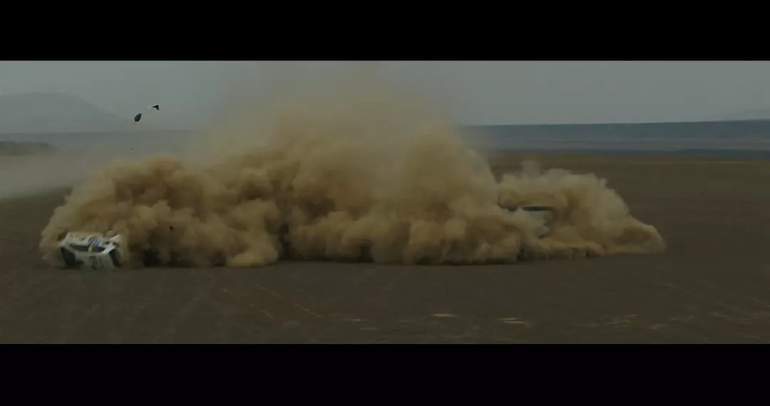 因此,拍摄前期经常要反复拍很多次,第一是速度真的太快,嗖的一下就不见了;第二是时间太短,飞手、云台手要在零点几秒内迅速做出精准的反应几乎没可能;第三随机性太强,飞手、车手之间无沟通,时间节点稍微差别,就拍不到最佳画面。