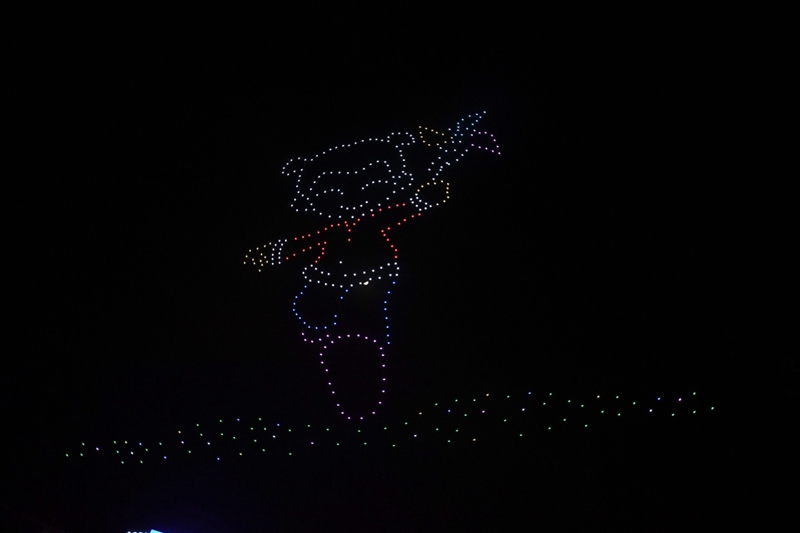 4月12日晚,无人机群在青海西宁夜空组成小女孩持风车奔跑的造型。