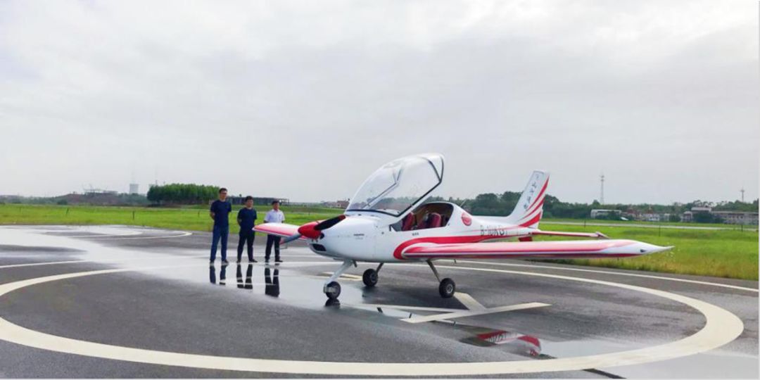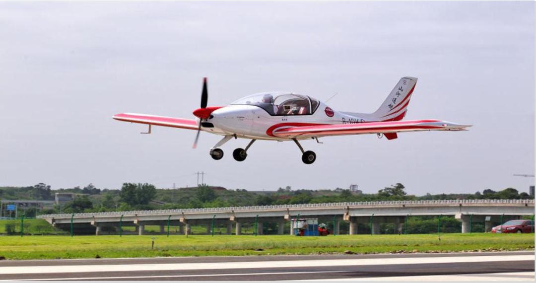 2019年5月13日,艳阳天!今日成都(金堂)通航产业园,碧空如洗;白色弧线标注的圆形停机坪内,一架装饰着红白条纹的山河SA60L轻型运动飞机安静地停放着。