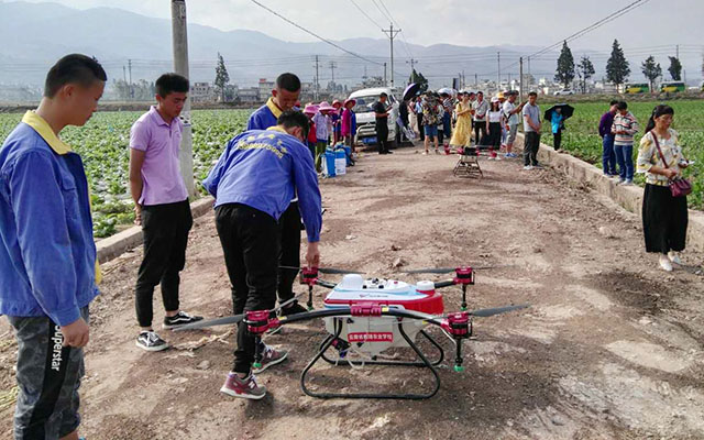 培训期间,参训人员到栋川镇海埂屯村委会现场学习草地贪夜蛾的识别,并观摩交流统防统治技术。现场云南天鹰兄弟技术人员向参训人员介绍了植保无人机性能,并进行了无人机统防统治草地贪夜蛾的飞防演示,其高效快速的防控能力得到参训人员的赞赏。