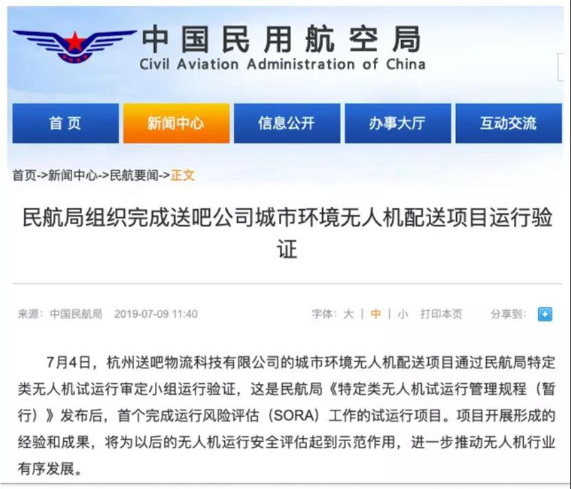 2019.10. 迅蚁送吧获民航局颁发全球首张城市物流无人机试运行“牌照”
