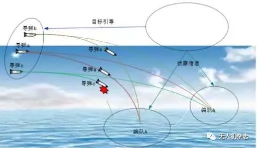 海战场电磁环境复杂,无人机和巡航导弹协同作战无法避开突防抗扰问题。海战场前沿部署的无人机群组成一个信息源网络,为巡航导弹集群提供精准的目标指示信息,无人机群中一架或多架无人机遭受打击,不影响其他无人机正常工作,增强巡航导弹集群在复杂电磁环境下的突防能力。由于无人机电磁辐射相对较小,通信流量小、频率较低、保密性好,不易被敌方发现和截获,能够有效引导巡航导弹进行静默攻击,同时,先行遮蔽和干扰敌防空节点,致盲或延长敌空袭预警时间,提升巡航导弹突防能力。无人机引导巡航导弹集群编队飞行,能够降低敌方对巡航导弹集群之间通信链路的干扰,使巡航导弹按照预定的路线飞行,而巡航导弹对敌关键节点的精确打击,可以有效压制敌方防御体系,大大提高巡航导弹的突防能力。