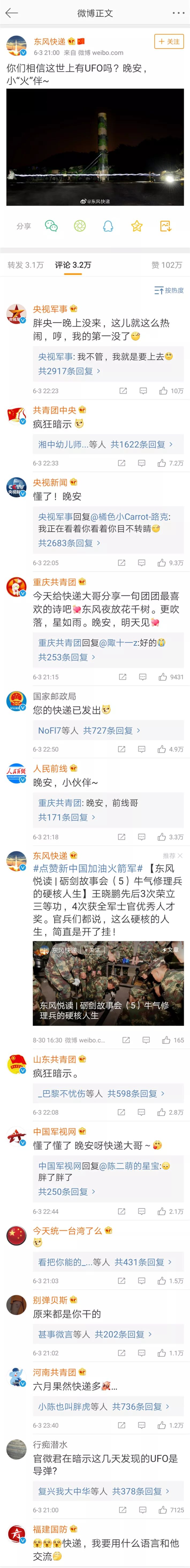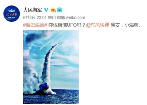 6月3日晚火箭军和海军的微博官方账号却进行了一次耐人寻味的互动,先是火箭军官微发了一个动态,说:“你们相信有UFO吗”,两小时后海军官方账号@了火箭军:“你也相信UFO吗?”