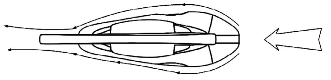 无人机在前进时的水流用大箭头表示,与无人机的机身进行冲击后,因机身的外形为椭圆形的,水流会沿机身的上下模面流去,使机身的上下面负压受力,上表面受力F1,下表面受力F2,因F1=F2,所以机身在受到水流的冲击时依然可以保持平衡。如图2和图3所示。