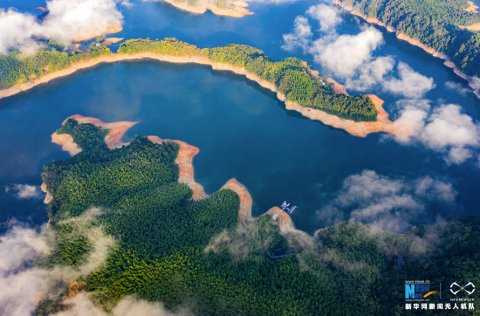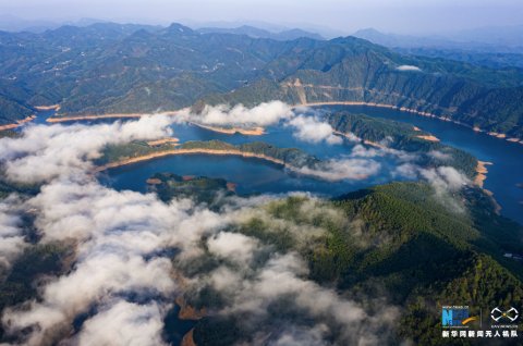 霍山县佛子岭水库云雾缭绕,美景如画(无人机拍摄)