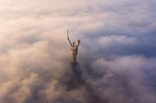 乌克兰基辅的纪念碑,被神秘的烟雾笼罩,令人震撼。