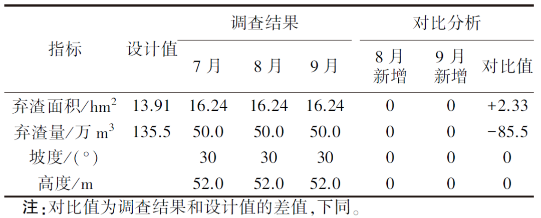 以某煤矿排矸场为例(表1),该排矸场设计面积为13.91hm2,实际弃渣面积16.24hm2,超出设计面积2.33hm2;设计弃渣量135.5万m3,实际弃渣量50.0万m3,未超设计弃渣;渣体边坡坡度30°,堆渣高度52.0m。