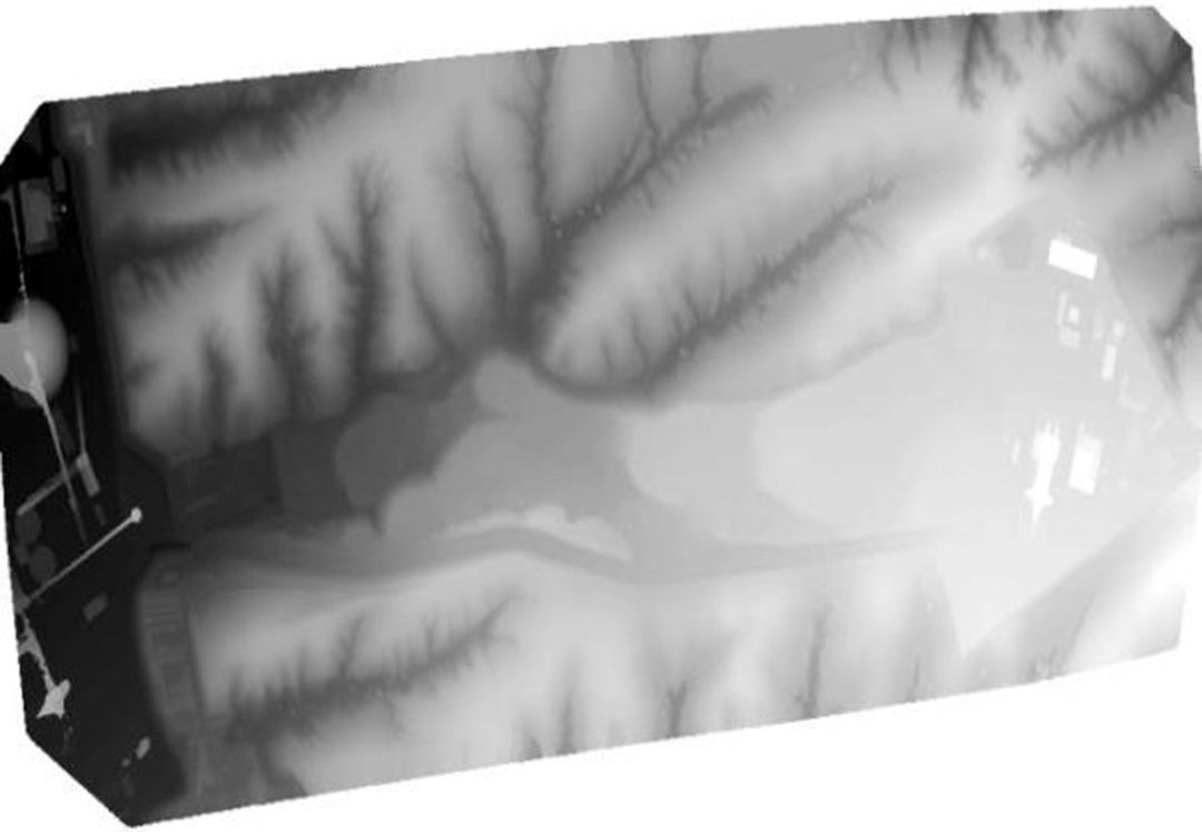 使用Pix4 Dmapper软件处理原始数据,形成数字表面模型(DSM)、数字正射影像图(DOM)和三维模型等成果,如图5、6、7所示。在ArcGIS中,利用DSM和DOM成果,获取经纬度、高程等位置信息;在Pix4 Dmapper软件中,利DOM成果,勾绘出弃渣场的范围,获取弃渣场面积;利用DSM成果,量算堆渣高度、坡度,勾绘弃渣场的范围,通过已知控制点与设计方案中的地形数据进行挖填方计算,获取弃渣量。