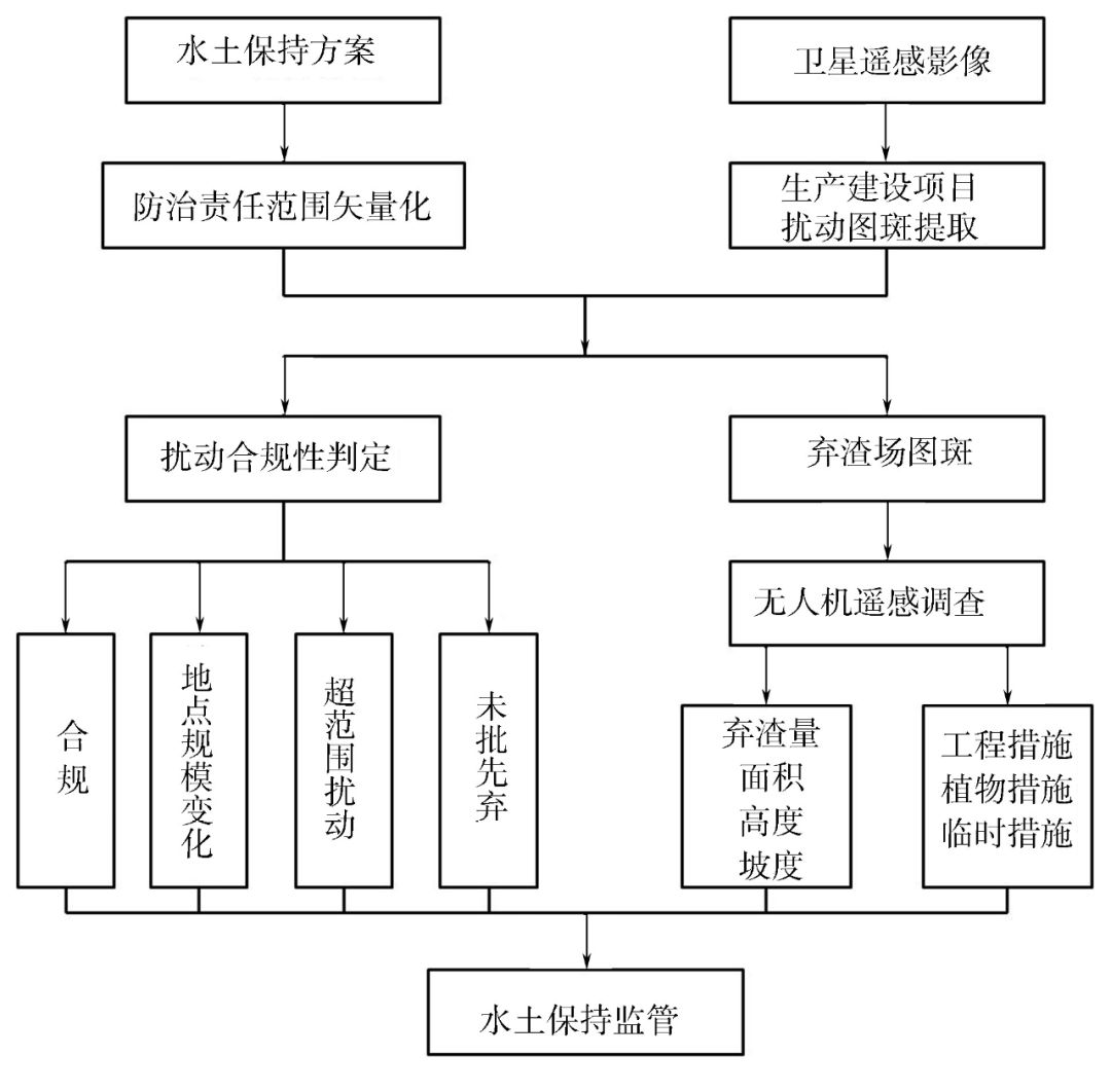 搜集晋陕蒙接壤地区在建部批生产建设项目水土保持方案,将防治责任范围图矢量化,并获取弃渣场选址信息;采用高分辨率卫星遥感影像,解译提取部批生产建设项目扰动图斑,将扰动图斑与防治责任范围图进行扰动合规性对比,判定扰动合规性,发现项目地点规模变化、超防治责任范围扰动、新设弃渣场未经原审批机关审批(以下简称“未批先弃”)等问题;选择重要弃渣场进行无人机遥感调查,提取弃渣场扰动范围、弃渣量、水土保持措施等信息;水土保持监管部门根据以上调查结果,对生产建设项目水土保持工作进行监管。技术路线如图1 所示。