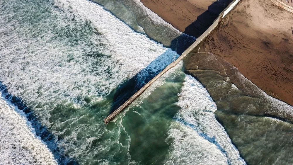 2019年1月10日,在墨西哥边境城市蒂华纳航拍的美墨边境墙。在墨西哥边境城市蒂华纳的海岸边,一堵数米高的边境隔离墙从海水中竖起,向东延伸,不见尽头。这里便是美国和墨西哥边境隔离墙的起点,有些来自拉美的移民选择在夜间从这里游过边境墙进入美国,但由于风大浪急,不少人丢了性命。