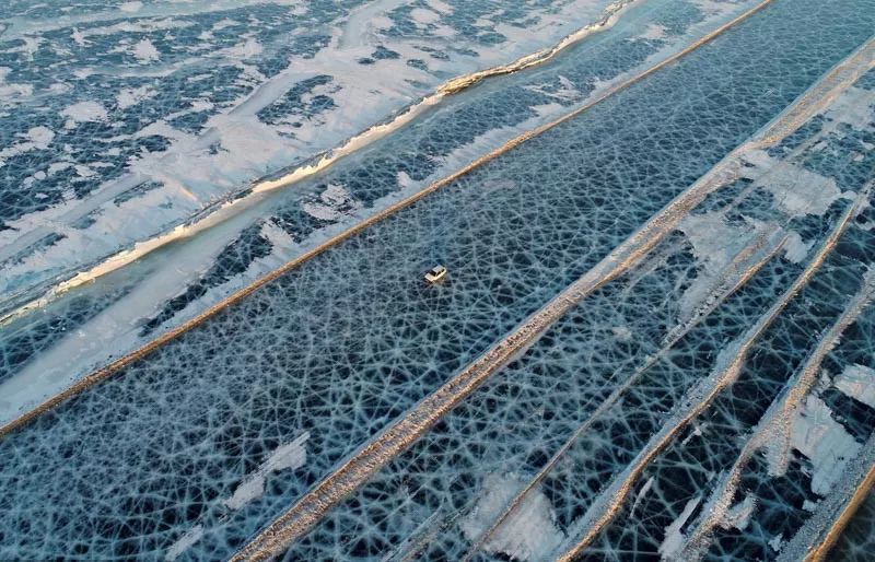 图为2019年3月3日,俄罗斯叶尼塞河,一辆汽车行走在5公里长的冰面上。