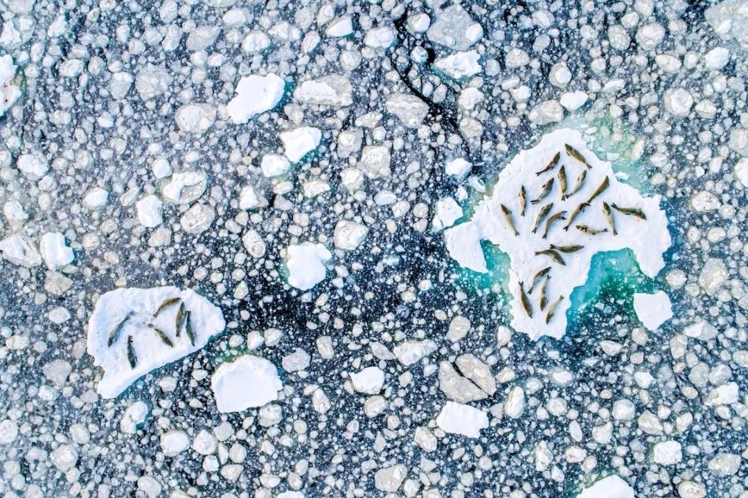 专业野生动物摄影师Florian Ledoux在南极航拍了这张照片。捕食蟹类的海豹喜欢在冰块上小憩。