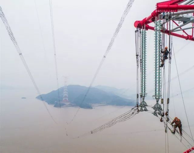 2019年1月3日,施工人员在浙江省舟山500千伏联网输变电工程380米跨海输电铁塔上进行验收和消缺作业(无人机照片)。