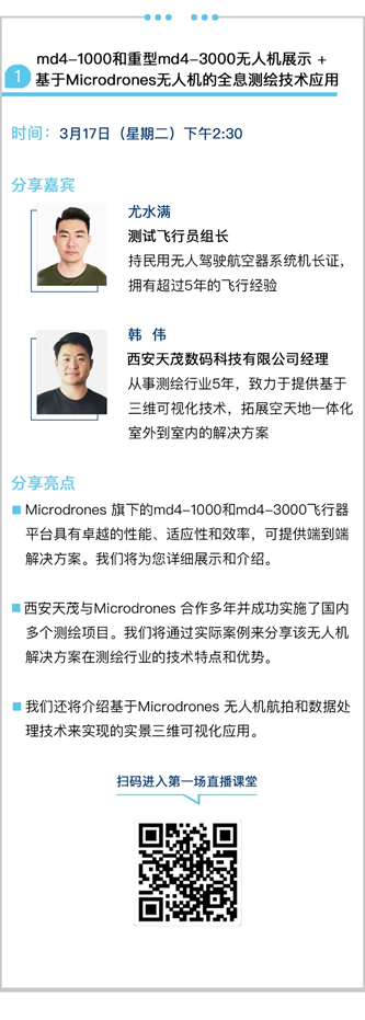 3月初Microdrones面向国内用户首次推出免费课程,吸引了众多业内人士观看,更有不少幸运的小伙伴成为Microdrones粉丝,收获了精美的答谢礼物。根据第一季课堂观众的反馈,我们认真挑选了第二季课程的选题,把重点放在Microdrones的新款产品重型md4-3000无人机的解读以及无人机应用案例的分享上。