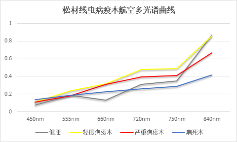 图6包括松树(以黑松为主)染病前后四个阶段的光谱曲线,分别为: