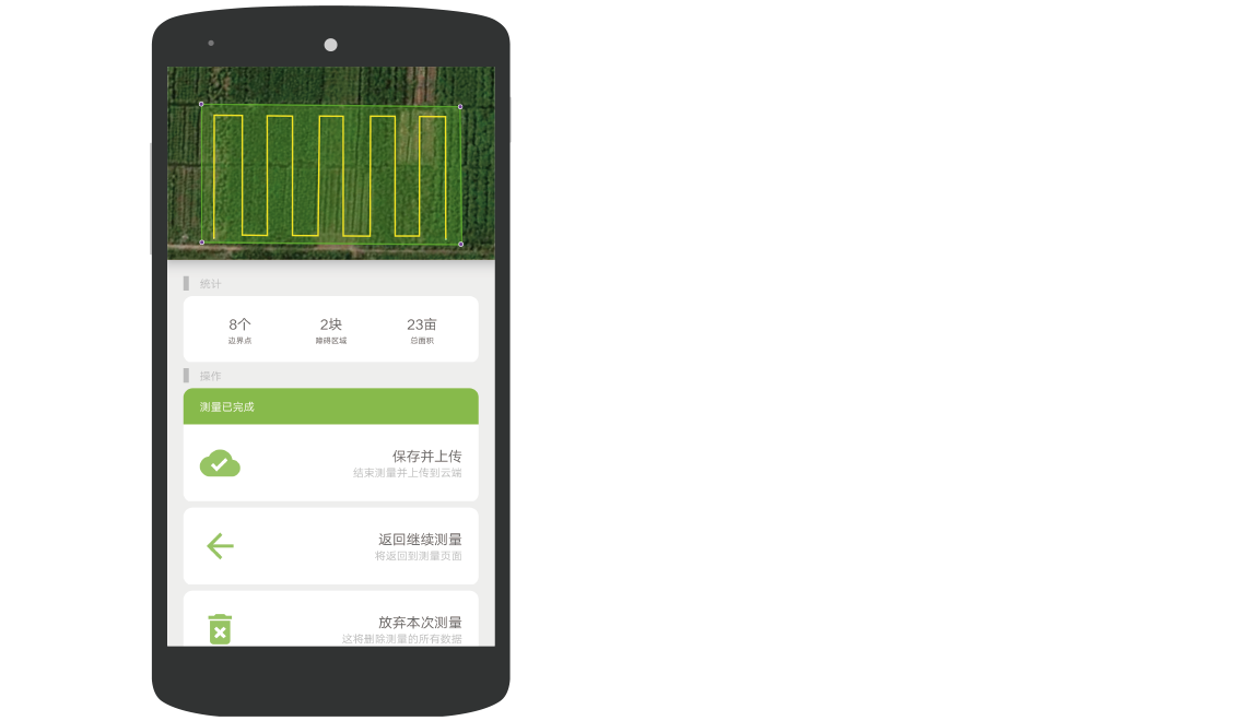 测绘APP结合手持测绘站和RTK基准站做到精确测绘。测绘数据和喷洒方案云储存,作业控制APP只需同步数据即可作业,无需重复测绘和设置。