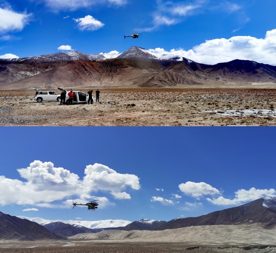 一眼望去,一路是戈壁沙滩,茫茫无边,极为壮观。但尽管高原景色美轮美奂,路途却是步步惊心,稍有不慎,便会身陷险境。然而,即使道路险阻,紫燕无人直升机团队仍然不畏艰险!