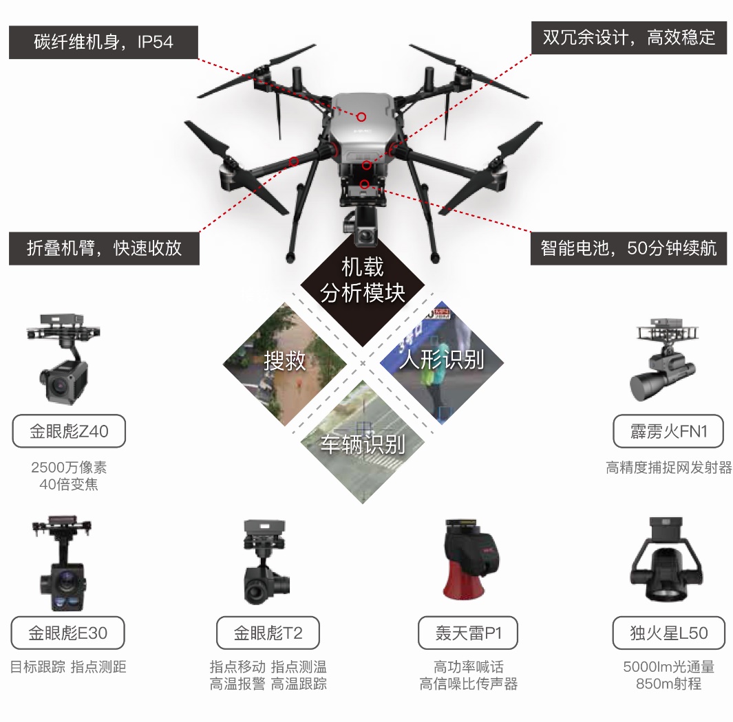其中这款入云龙无人机采用全碳纤维一体成型技术,具备工业级精度定位传感模块和无人机姿态传感模块。搭配天目调度平台软件,可以实现航线规划、自主悬停,同时可兼容或拓展分属警种的各类装备,在各类性能参数方面都要求较高,可应用于现场勘查、消防救援、交通管理、活动安保等安防领域。