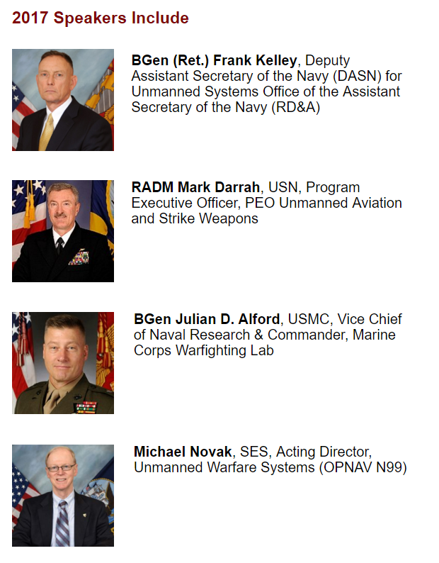 (AeroVironment公司、 AFRL,空中客车防务公司,ARMY CERDEC,Bipartisan政策中心,波音公司,英国大使馆,查尔斯河分析,复合工程,DON CIO,Drytech公司,FAA,通用动力学任务系统,佐治亚理工学院,HQ USMC,C4,Insitu,喷气推进实验室,NASA,联合防空作业中心,联合参谋部J-7,Kutta技术,L3通信,LMCO,洛克希德马丁公司,MAG DS公司,MIT,MuleSoft,N2 / N6 ISR航空能力,国家航空航天博物馆,NAVAIR,海军研究实验室,新泽西创新研究所,Neya系统公司,NGA,NOAA,诺思罗普格鲁曼任务系统,NRL,NSA,ODNI,航空服务办公室,USCG,OPNAV N2 / N6,OPNAV N2 / N6 / F23,OPNAV N2N6F22,OUSD(I),OUSD AT&L,PAE ISR,Parsons公司,PMA-268无人航空航空公司,NAVAIR,Q Global Strategies,Ramona Research,Inc.,Raytheon,Rockwell Collins ,SAIC,战略系统计划,美国海军,系统研究和模拟公司,Textron系统,航空航天公司,约翰霍普金斯大学APL,TSC,美国海军)