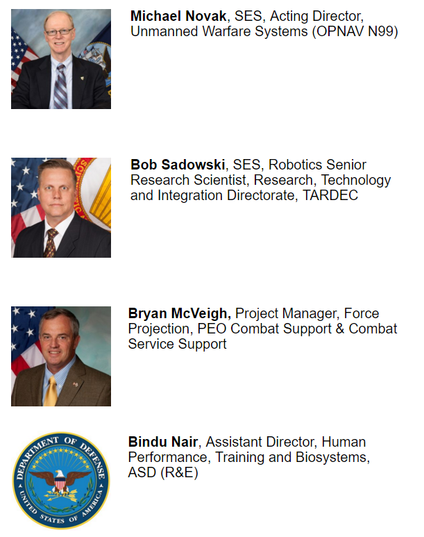 AeroVironment, Inc.; AFRL, Airbus Defense and Space Inc., ARMY CERDEC, Bipartisan Policy Center, Boeing, Booz Allen Hamilton, British Embassy, Charles River Analytics, Composite Engineering, DON CIO, Drytech, Inc, FAA, General Dynamics Mission Systems, Georgia Tech Research Institute, HQ USMC, C4, Insitu, Jet Propulsion Lab, NASA, Joint Air Defense Operations Center, Joint Staff J-7, Kutta Technologies, L3 Communications, LMCO, Lockheed Martin Corporation, MAG DS CORP., MIT, MuleSoft, N2/N6 ISR Air Capabilities, National Air and Space Museum, NAVAIR, Naval Research Laboratory, New Jersey Innovation Institute, Neya Systems, LLC, NGA, NOAA, Northrop Grumman Mission Systems, NRL, NSA, ODNI, Office of Aviation Services, USCG, OPNAV N2/N6, OPNAV N2/N6/F23, OPNAV N2N6F22, OUSD (I), OUSD AT&L, PAE ISR, Parsons Corporation, PMA-268 Unmanned Carrier Aviation, NAVAIR, Q Global Strategies, Ramona Research, Inc., Raytheon, Rockwell Collins, SAIC, Strategic Systems Programs, U.S. Navy, System Studies and Simulation, Inc., Textron Systems, The Aerospace Corporation, The Johns Hopkins University APL, TSC, US Navy