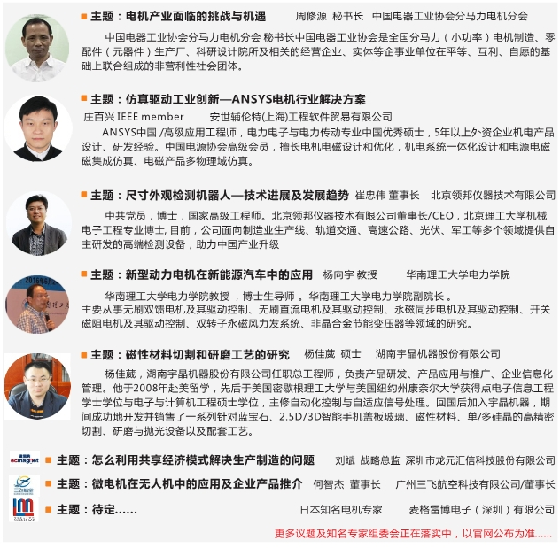 2017小电机制造及应用研讨会将以“微电机与控制应用”为主题,其中包括协会、院校著名资深教授、知名电机制造企业总工于各企业家和工程师展开深入讨论!