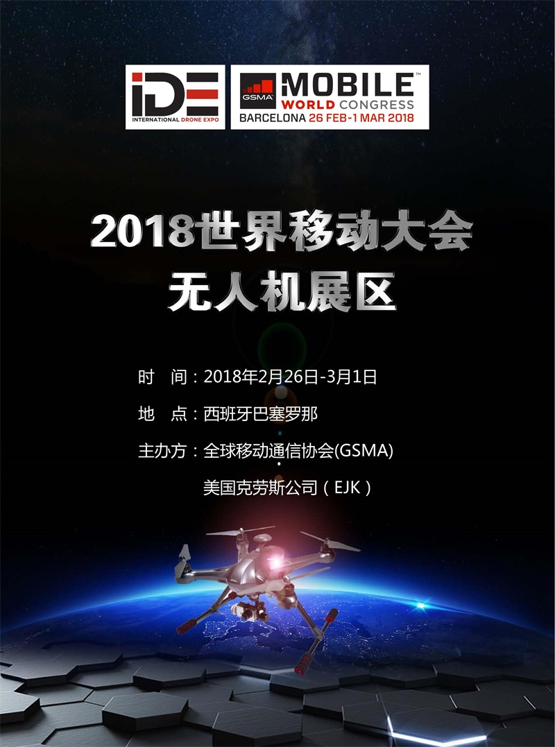 世界移动大会IDE无人机展由全球移动通信协会(GSMA)与美国克劳斯公司(EJK)共同主办。IDE无人机展是世界移动大会中通信与高科技跨界融合创新的新亮点。设置在最受关注的聚焦下一代创新的科技馆专区中(8.0馆)。