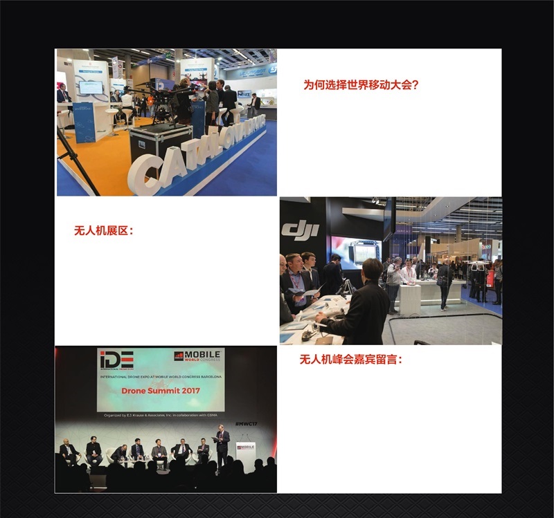 2017年世界移动大会IDE无人机展,成功吸引了世界无人机生产巨头大疆DJI和深圳高巨以及来自加泰罗尼亚地区强大的智能无人机生产厂商,Barcelona Drone Center, Airk, E-Stratos, Hemav, Eurecat TechnologyCenter, Reimagine Drone, Flying Free Films and SITEP等企业参展。展会期间举办的IDE无人机峰会,邀请到多家知名移动运营商及无人机生产企业专家演讲,并吸引了超过200位企业高层参会。