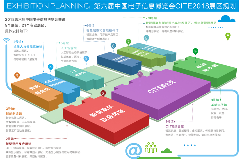 按照展览内容和特色,博览会共分为——1号馆-CITE综合馆:智慧家庭、智能硬件、虚拟现实、传感器与物联网、大数据、互联网+、智能制造、集成电路等展区;2号馆-新型显示与应用馆:OLED显示展区、车载显示展区、医疗显示展区、教育显示展区、可穿戴显示展区、交通显示展区与应用终端展区、显示设备材料展区、新型材料展区;3号馆-智能制造馆:智能机器人展区、大数据展区、无人机展区、智能监控和辨识展区、智慧工厂自动化展区;4号馆-机器人与智能系统馆:机器人展区、智能标签(RFID)与芯片智能卡展区等;5号馆-人工智能馆:人工智能生态系统展示,包括教育、医疗、交通等各方面;6号馆-智慧城市和智能硬件馆:智慧城市、可穿戴产品展区、智能硬件创客展区;7、8号馆-智能网联与新能源汽车技术展区、锂电新能源展区,智能网联与新能源汽车展区;锂电池展区、锂电设备材料展区;9号馆-基础电子馆:元器件、材料、仪器、设备、特种电子。其中5号馆是博览会重点打造的“人工智能馆”。