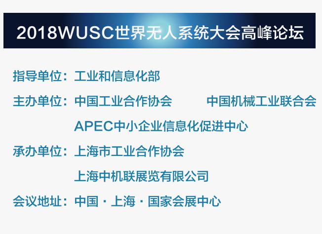 随着新一年的到来,为了在人工智能新时代下加快推进无人系统创新应用,2018年7月4-7日由工信部指导,中国机械工业联合会、中国工业合作协会、APEC中小企业信息化促进中心主办,由上海市工业合作协会、上海中机联展览有限公司、世界无人系统展示交易中心承办的“2018 WUSC世界无人系统大会”即将在国家会展中心(上海)隆重举行,大会由无人系统展览会和无人系统大会高峰论坛(7月5-6日)组成。以“创新、协同、融合、共享”的理念,以创新应用推进行业发展为落脚点,推动无人系统在物流、农业、测绘、电力巡线、安全巡测、应急救援、渔政城管交通执法等行业领域的创新应用。