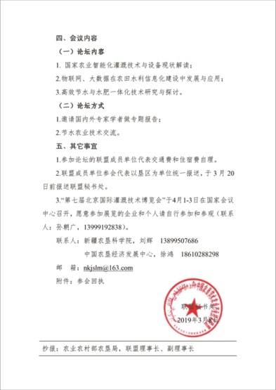2019中国灌溉发展大会将于4月1-3日在北京国家会议中心举办,大会由振威展览股份新疆振威国际展览有限公司承办。同期召开第三届“一带一路”节水农业高峰论坛,作为节水高峰论坛主办方的中国农垦节水农业产业技术联盟已将参会通知下发至联盟协调委员会、专家委员会和全国农垦系统成员单位,全面组织垦区各单位代表参会。