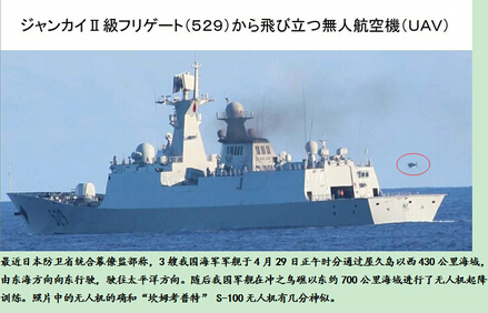 2013年左右,英国媒体报道过根据日本防务省的统合幕僚监部的新闻稿,日本海上自卫队在西太平洋水域拍摄的照片显示,一架类似“坎姆考普特”(CAMCOPTER S-100)无人机在054A型导弹护卫舰“舟山”号上空飞行。