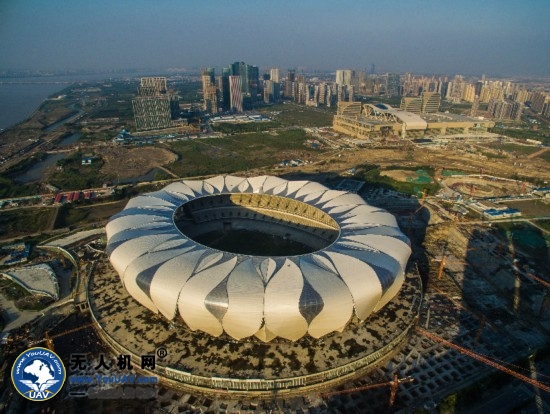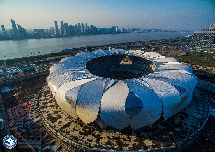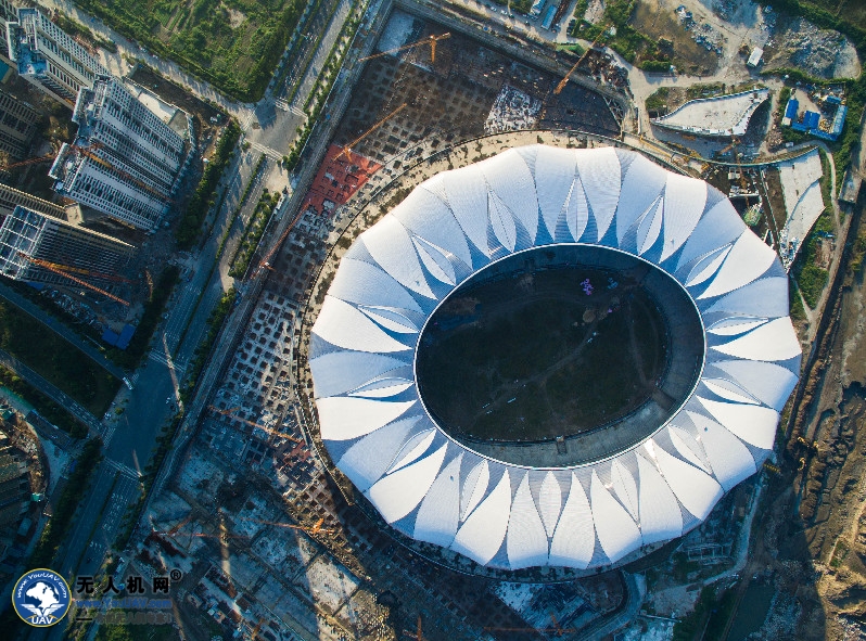 主体育场外墙的金属花瓣都已经建设完成,该体育场的外形好似莲花,由28片大花瓣和27片小花瓣组成。其占地面积为8.29万平方米,总建筑面积达22.5万平方米,观众席设计标准为80000座。