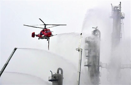 在黄浦江完成汲水的Ka-32消防直升机又回到了事故现场,在装置东侧扑灭高空火点。