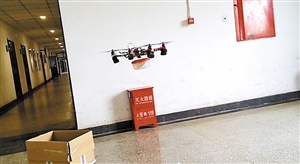 记者在现场看到,装上引导系统的简易无人机装置能在操控下飞过障碍物,准确地将物品“投篮”送进一个小框中。赵小铭称,无人机物流投送的整个流程非常简单,载货起飞、