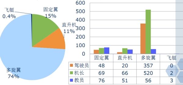 截至2015年11月1日,取得驾驶员合格证的人数为1250人,其中航空器类别为固定翼193人,直升机137人,多旋翼933人,飞艇5人。