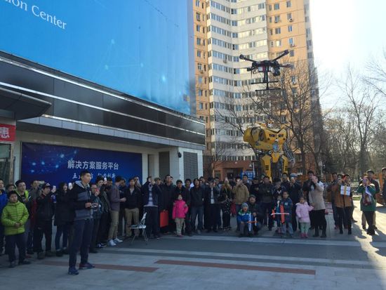 会后场馆外还进行了精彩的无人机试飞活动,吸引了大批市民驻足观看。