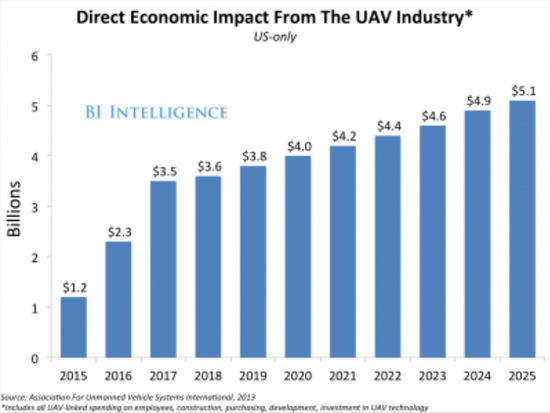 世界上的一些顶级工业公司,比如Qualcomm、Intel、GE和Boeing,早就对无人机初创公司进行了投资。随着更多国际公司的加入,这类初创公司的投资还将持续增长。2016年美国市场上的无人机行业将获得23亿美元投资。