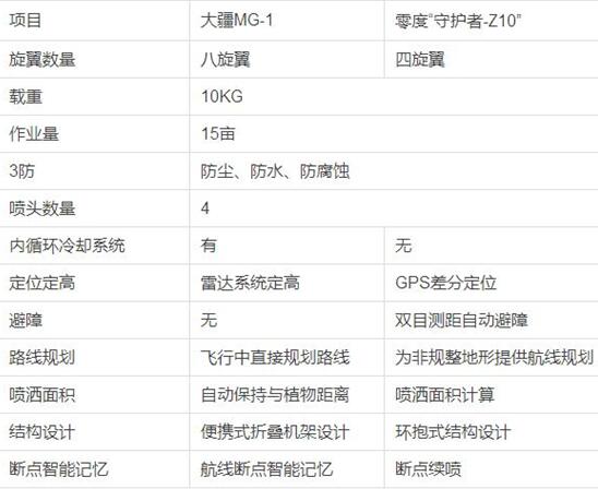零度智控“守护者”与大疆“MG-1”对比。(图片来源:无人机世界)