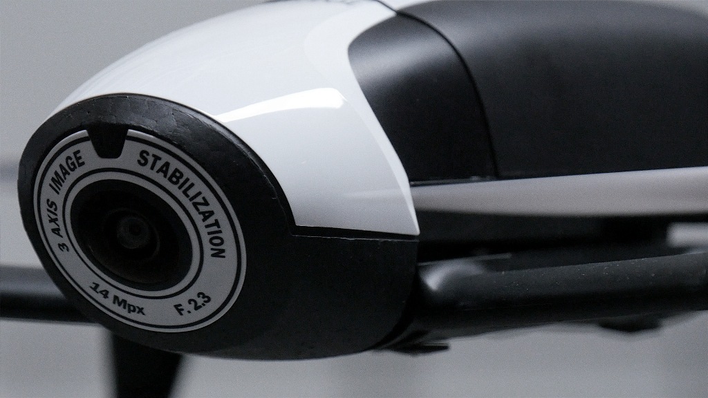 Bebop 2配备一个1400万像素前置“鱼眼镜头”。该摄像头专为Bebop 2而设计,可在操控设备上实时显示飞行画面。玩家可在操控设备上划动拇指对摄像头的拍摄角度进行180度的数字化调整。
