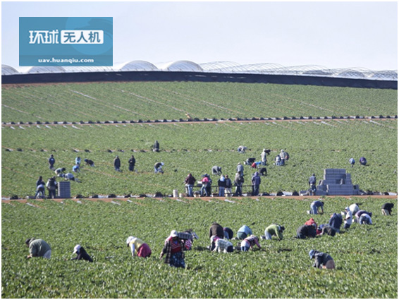 据2013年经济影响报告称,目前,精细农业和公共安全需要占据民用无人机90%的市场。图为农场工人在加利福尼亚半岛San Quintin小镇的农场里摘草莓,拍摄于2015年3月25日。