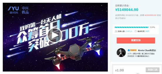 12月10号疆域智能联合中兴微品智能007项目一起发布的超级新式无人机Hornet S(大黄蜂)昨日12月14日正式以“我的第一台无人机”为主题登录淘宝众筹和淘宝创想力量。众筹速度增长迅猛,目前已经突破了500万元,有20000人参与,可以说是目前最成功的无人机项目,没有之一。看来爱好者们对消费级无人机期待已久。