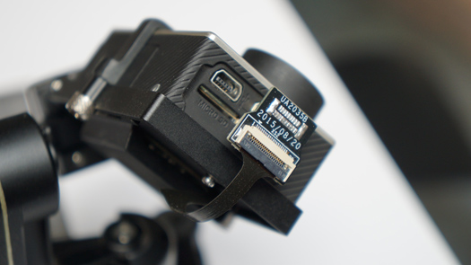 ProDrone的云台用的是我们常说的2轴半的设计,值得表扬的是云台精度控制比较不错。而且通过遥控器可以控制俯仰(Pitch)和方向旋转(Yaw)比较方便,横滚(Roll)是自动修正保持水平。云台的减震是采用4颗黑色胶球,在配件包里没有看到其他软硬度的胶球,不知道未来的产品里有没有其它软硬度的胶球,随着气温的变化应该采用不同软硬度的胶球才可以达到更好的减震效果。