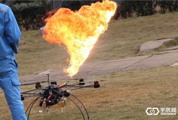 由南方电网广州供电局有限公司自主研发的无人机,在模拟高压线路带电的情况下,展示了无人机喷火清除线路飘挂物,无人机在空中对准飘挂物喷射出一道火柱,熊熊火势在瞬间就把飘挂物烧落,实现了无人机从巡线到检修的跨越,大大提高了作业的效率,赢得了现场观摩人员的好评和掌声。