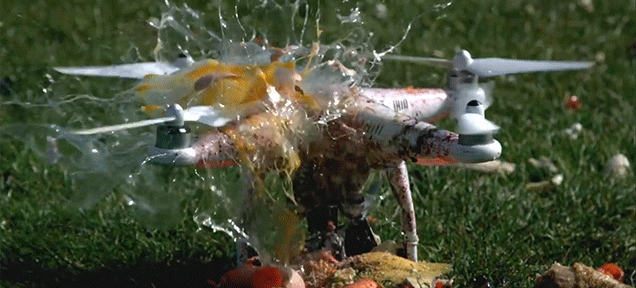 至于具体的杀伤力能到哪一种程度?上面这张GIF图或许可以说明一切。在图中我们可以清楚的看到,落下的鸡蛋在掉落到相关位置时,被旋转的螺旋桨瞬间打出了成吨的伤害,真的可以说是瞬间爆炸了。并且,这个无人机的螺旋桨还并没有处于旋转的最佳状态。