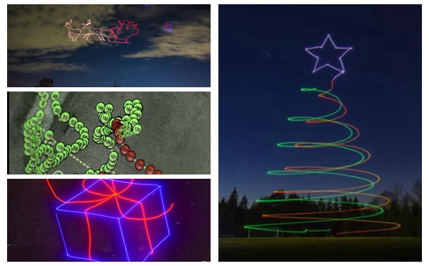 除了舞蹈,无人机也有独特的绘画天赋。德国Ascending Technologies公司将“光涂鸦”这样的绘画手法运用到无人机上,他们将可以变化颜色的光束灯安装在电脑控制的无人机上,无人机通过这种灯在夜空中做出一系列美丽的动态图画。