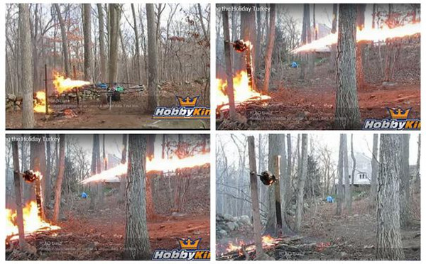 近日,来自HobbyKing网站上的一段无人机烧烤的视频,在国外的网络上疯狂传播。视频中,有人在一架无人机上安装了一只火焰喷射器,在飞行状态下不断地向火鸡喷出火焰,无人机一会离火鸡很近,一会又离火鸡很远,火焰也是时大时小,烧烤方式独特、另类、新奇!